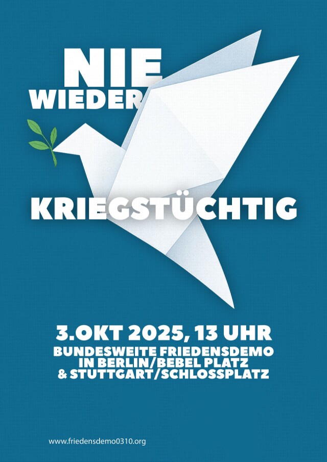 Dieses Bündnis ist entstanden aus der Initiative „Nie wieder Krieg – Die Waffen nieder!“ und einem Aktionsbündnis innerhalb der Friedensbewegung, an dem u. a. ICAN, DFG-VK, IPPNW, Netzwerk Friedenskooperative, Ohne Rüstung Leben und pax christi beteiligt sind. Wir wollen zwei bundesweite große Demonstrationen zeitgleich in Berlin und Stuttgart durchführen, die die verschiedenen Flügel der Friedensbewegung gemeinsam repräsentieren.